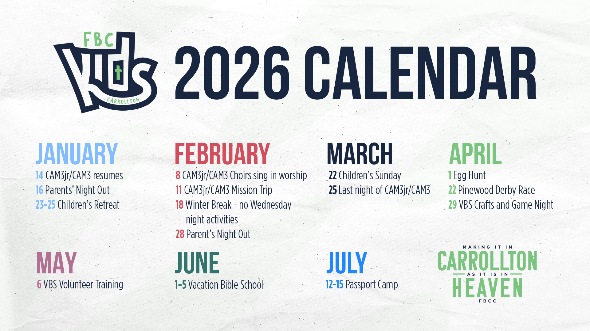 CAM3 and CAM3jr meet on Wednesday nights during the school year from 5:30-7:00pm. CAM3jr is designed for younger children in PreK and Kindergarten; CAM3 is designed for 1st – 5th graders. Both of these programs use a rotation model where children go to centers such as Bible basics, worship arts, music, missions, games, etc.