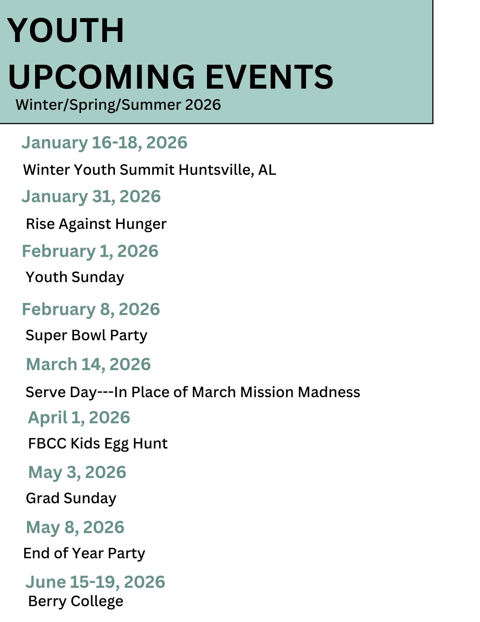 FBCC Youth has weekly events that you can jump into and make your own!